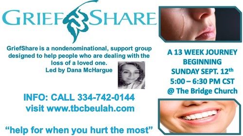 If you have ever lost a loved one, please join us for 13 weeks of healing and recovery. This proven 13 week teaching and discussion has literally helped 10 of thousands of grieving people with 1000's of Grief Share Groups across the world. These sessions are for anyone in this region regardless of whether you go to church or don't go to church. We are so excited to announce that Dana McHargue will be leading this group. She has been through grief in her own life and will be able to relate to you. There is no charge for the sessions but there is a workbook available for $15 and if you can't afford it let us know. The 1st Session Sunday Sept 12 at 5pm then every Sunday the same time through Dec. 19th except for Oct. 31st, Nov. 28th.